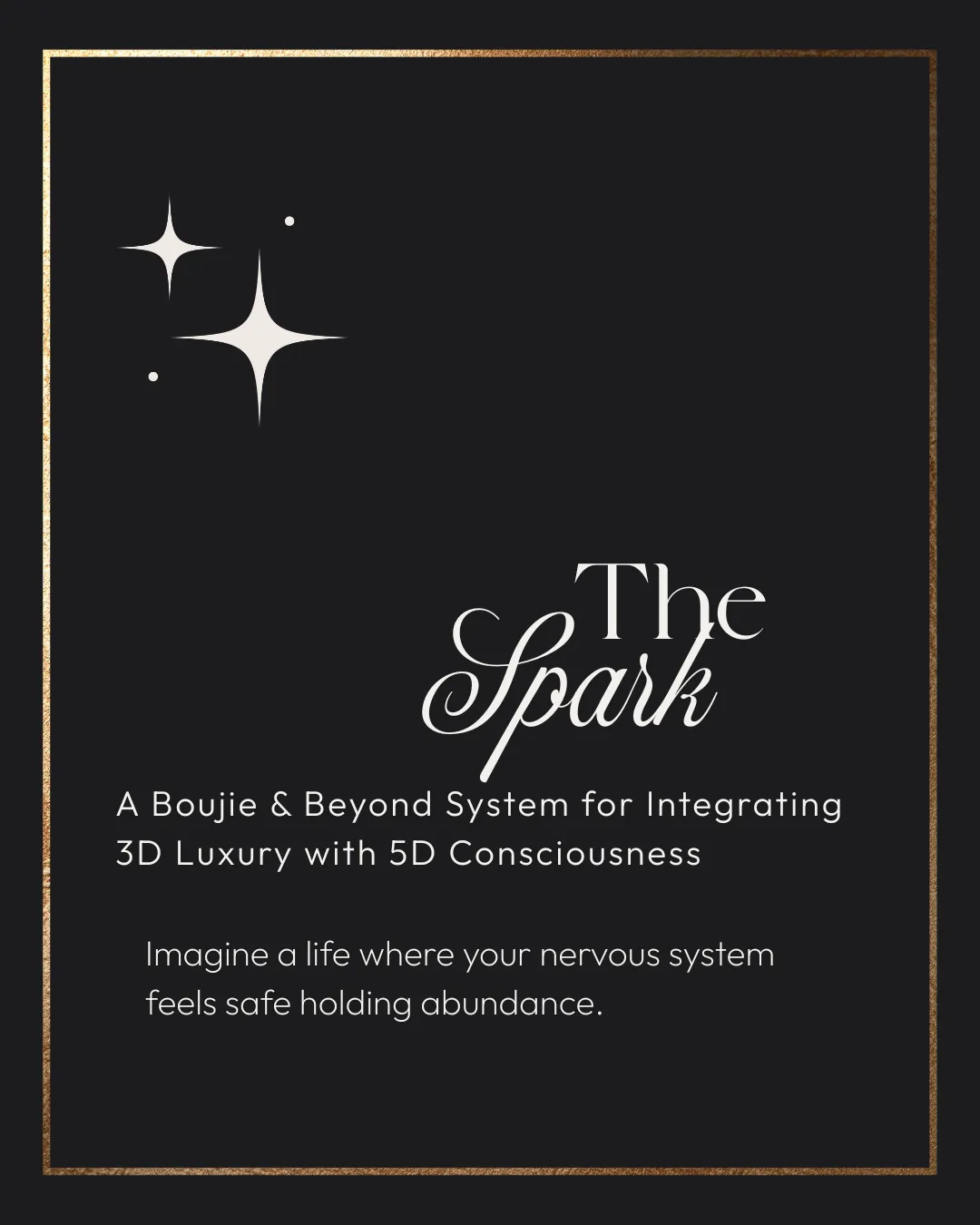 The Spark is a 5-part system designed to help you integrate 3D luxury with 5D consciousness—using your pet as the mirror to reveal the real blocks beneath repeating challenges. Inside, you’ll move through the Boujie & Beyond five-stage awakening process (Self-Discovery → Death & Rebirth → Focus Energy → Soul Nudges → Awakening) with guided prompts, energetic tools, and practical support.